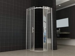 Kwart ronde douchecabine met 2 schuifdeurtjes.