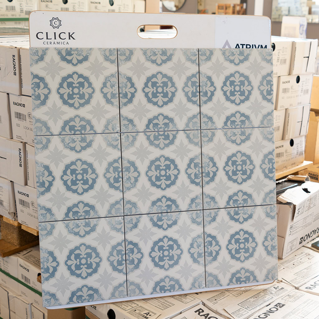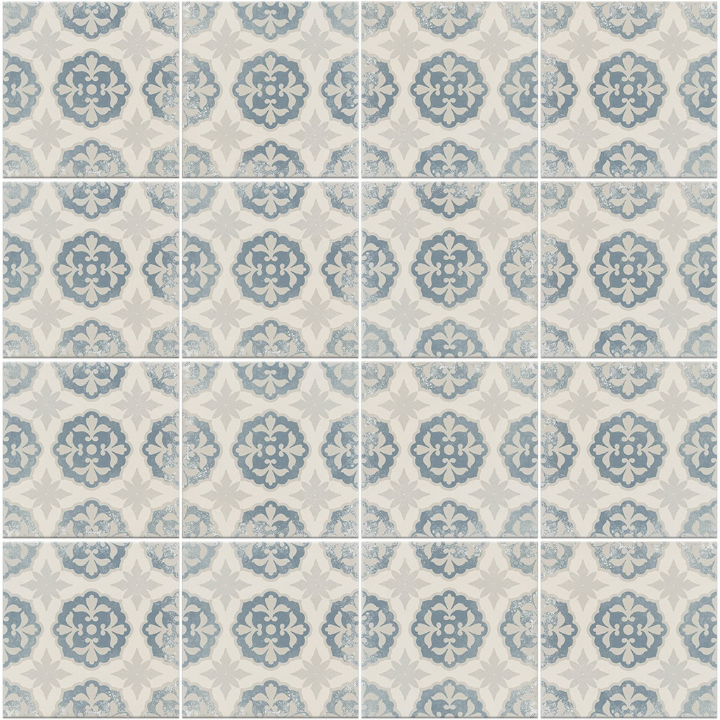 Keramische portugese vloertegels 20×20 grijs met blauw bloemetjes patroon