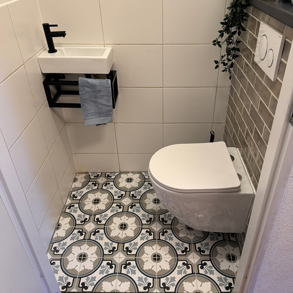 Keramische portugese vloertegels 20×20 wit met blauw zwart en grijs bloemetjes patroon